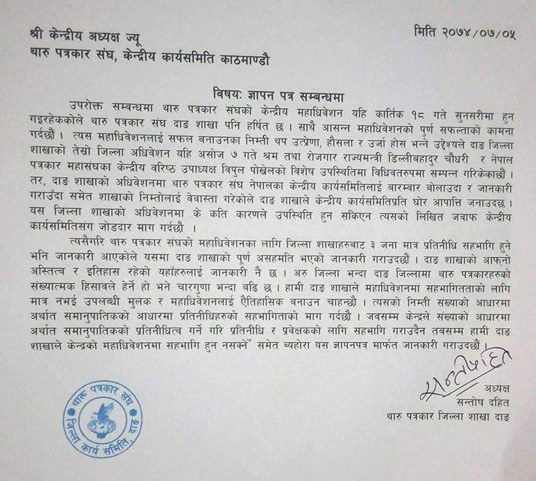 काठमाडौं, कात्तिक ६ गते । थारु पत्रकार संघ नेपाल दाङ शाखाले असोज ७ गते शाखाको जिल्ला अधिवेशनमा केन्द्रीय प्रतिनिधि आउन नसकेको कारणसहितको केन्द्रसँग लिखित जवाफ माग गरेको छ ।