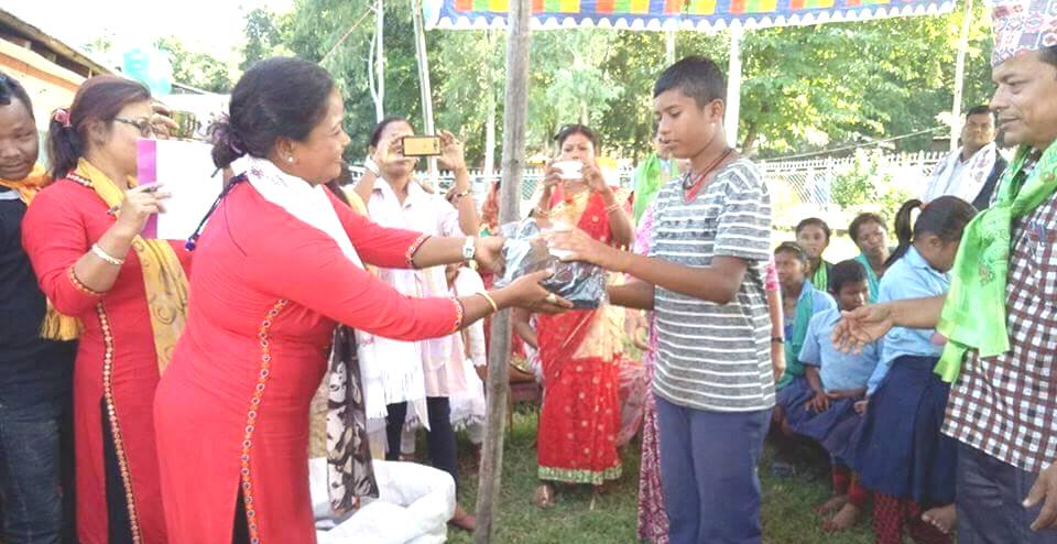 न्यानो कपडा सँगसँगै कापी, कलम र पेन्सील पनि सो बालबालिकालाई वितरण गरिएको अध्यक्ष चौधरीले बताउनुभयो । नर्सरी कक्षादेखि १४ वर्ष उमेर रहेका विद्यार्थीलाई सो सामान एक समारोहकाबीच वितरण गरिएको चौधरीले बताउनुभयो ।