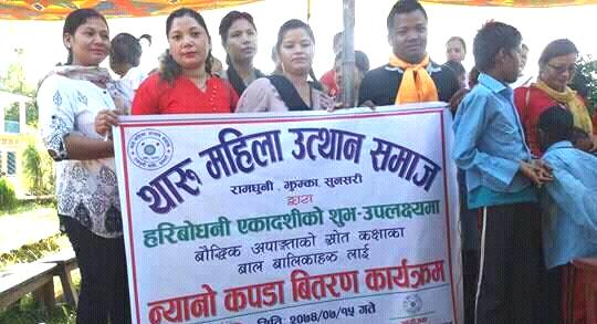 दीपावलीको अवसरमा देउसी भैली खेलेर संकलन गरिएको रकममध्ये २० हजार रुपैयाँको न्यानो कपडा किनेर बालबालिकालाई वितरण गरिएको समाजकी अध्यक्ष सीता चौधरीले बताउनुभयो । अरुले देउसी भैली खेलेर संकलन गरेको रुपैयाले वनभोज खाएर सक्काउँछन्, हामीले बालबालिकालाई न्यानो कपडा वितरण गर्यौ उहाँले भन्नुभयो ।