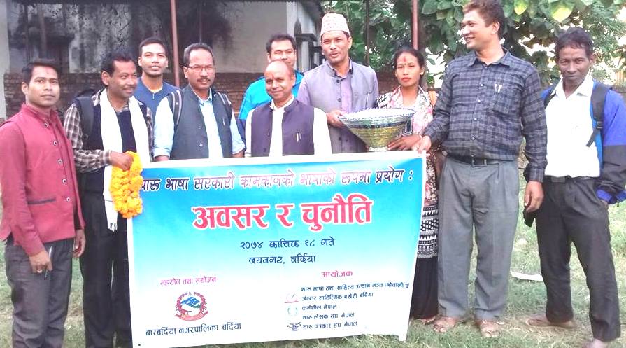 बारबर्दिया नगरपालिकाको आर्थिक सहयोग तथा समन्वय र कर्मशील नेपाल, थारु भाषा तथा साहित्य उत्थान मञ्च, थारु पत्रकार संघ, जंग्रार साहित्यक बखेरीको आयोजनामा कातिक १८ गते बारबर्दिया नपामा भएको थारु भाषालाई सरकारी कामकाजको रुपमा प्रयोग गर्न माग गरिएको हो ।