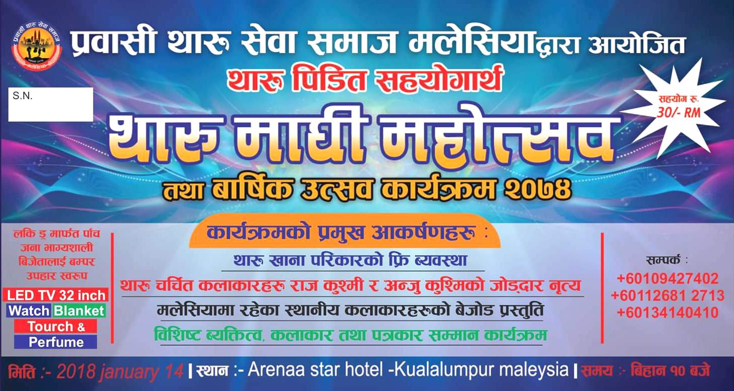 मलेसिया, पुस ७ गते । मलेसियाको इतिहासमै पहिलो चोटि थारु माघी महोत्सव तथा बार्षिक उत्सव २०७४ कार्यक्रम आयोजना हुन गइरहेको छ ।