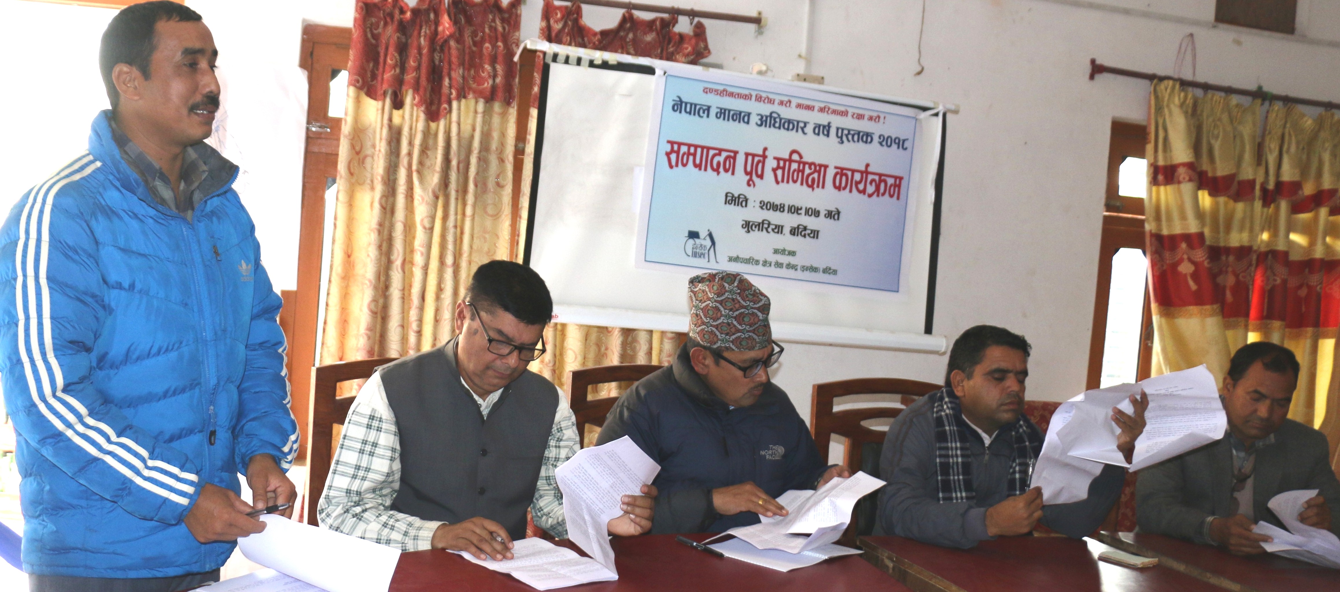 इन्सेक बर्दियाको आयोजनामा पुस ७ गते गलरियामा मानव अधिकार वर्ष पुस्तक सम्पादन पुर्व समिक्षा सम्पन्न गर्दै वक्ताहरुले उक्त कुरा बताए ।