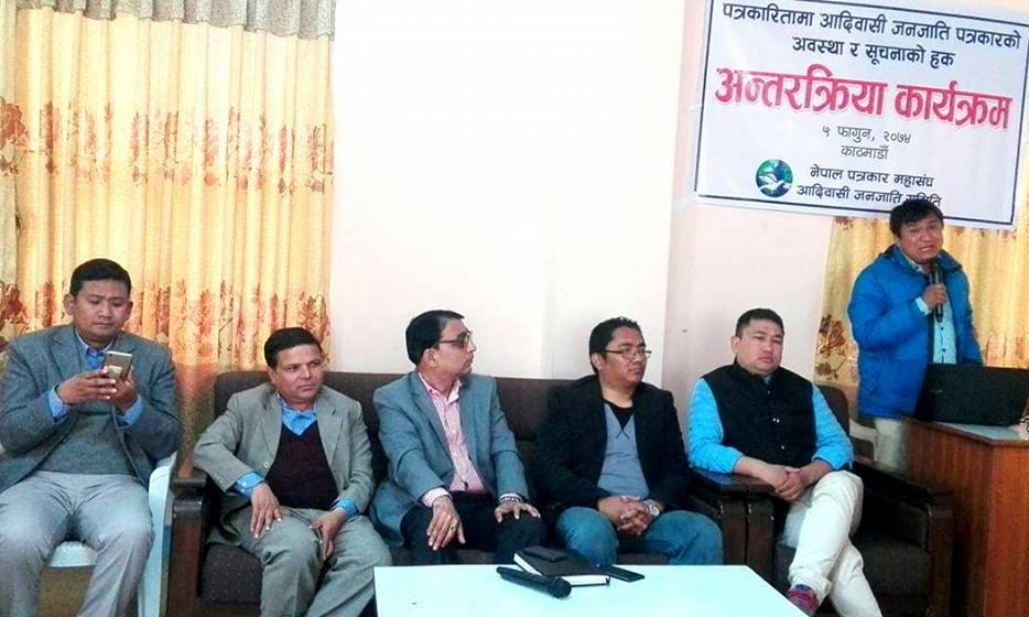 नेपाल पत्रकार महासंघको आदिबासी जनजाति समितिद्वारा शनिबार यहाँ आयोजित ‘पत्रकारितामा आदिबासी जनजाति पत्रकारको अवस्था र सूचनाको हक’ विषयक अन्तरक्रिया कार्यक्रममा वक्ताहरुले त्यस्तो बताउनुभयो ।