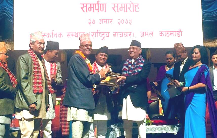 प्रधानमन्त्री ओलीले बुधबार राष्ट्रिय तथा प्रादेशिक प्रतिभा पुरस्कार, महाकवि देवकोटा पुरस्कार, भगत सर्वजित मानव मर्यादा राष्ट्रिय पुरस्कार र गोपालप्रसाद रिमाल राष्ट्रिय पुरस्कारबाट ३८ जना स्रष्टाहरूलाई सम्मानित गर्नुभयो ।