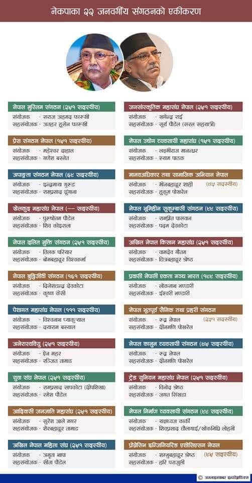 काठमाडौं, जेठ ३ गते । तत्कालिन एमाले र माओवादीबीच एकीकरण भएको एक वर्ष पुगेको छ । वर्ष दिन पुगेपछि नेकपाले आफ्ना २२ वटा जनवर्गाीय संगठनहरुको एकीकरण टुंग्याएको छ । जनवर्गीय सगठनमा सबैभन्दा उपल्ला नेतामा वामदेव गौतम रहनुभएको छ ।