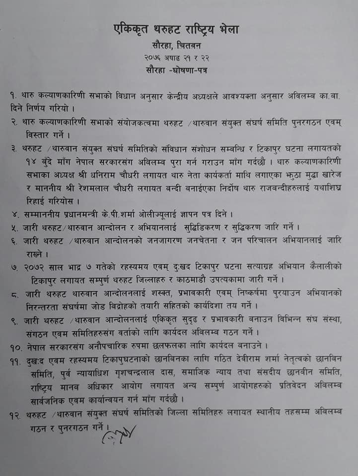 चितवनमा शनिबार र आइतबार जारी भेलाको २१ बुँदे निस्कर्ष निकाल्दै थाकसले आगामी आन्दालन र दवावको कार्यक्रम संयुक्तरुपमा गर्ने सहमति गरेको हो । यसअघि थरुहट थारुवान संघर्ष समितिको नाममा दुई खेमामा विभाजित थारुलाई एकीकृत गरी सहमतिमै कार्यक्रम गर्ने भेलाले निर्णय गरेको महामन्त्री प्रेमीलाल चौधरीले बताउनुभयो ।