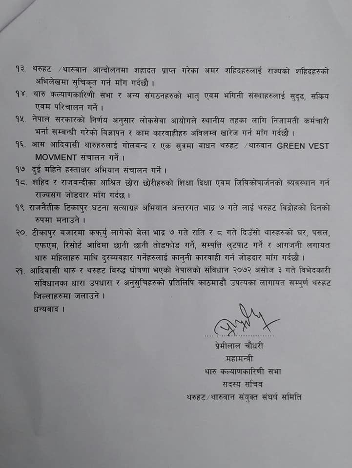 भेलाले टीकापुर घटना तथा अन्य आन्दोलनका क्रममा पक्राउ परेका थारु राजबन्दीहरुको रिकाईको पहल गर्ने, भदौ ७ र ८ गतेको कार्यक्रम उपत्यकासहित देशभरका थारु जिल्लामा कालो दिनकोरुपमा मनाउने, थारु माग मुद्दा र राजबन्दीको रिहाईका विषयमा प्रधानमन्त्री केपी शर्मा ओलीलाई ज्ञापनपत्र बुझाउने, राजबन्दीका परिवारका सदस्यहरुको पठन पाठनकालागि पहल गर्ने, थारु शहीदलाई शहिदमा सूचीकृतका लागि सरकारसँग पहल गर्ने लगायतको प्रस्ताव थाकसले तयार गरेको छ ।