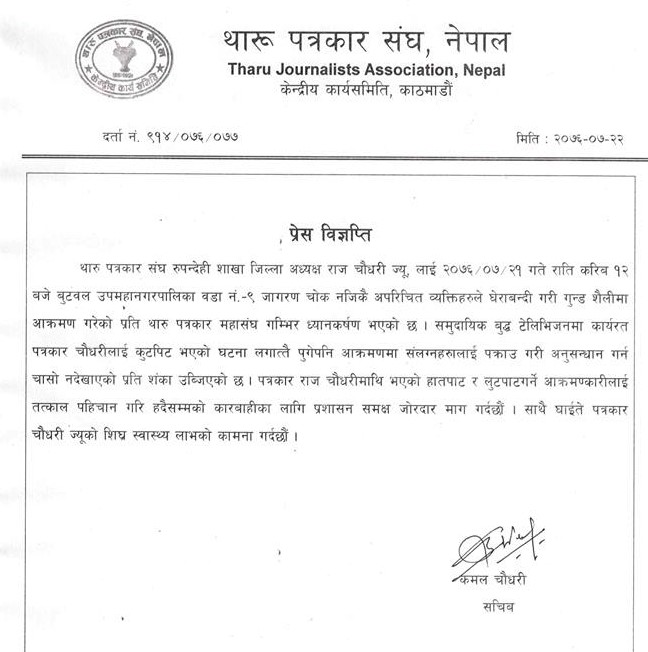 यसैबिच पत्रकार महासंघ रूपन्देहीले पत्रकार चौधरीमाथि भएको घटनाप्रति बिरोध जनाउदै घटनामा संलग्नलाइ तत्काल पक्राउ गरि कानुनी दायरामा ल्याउन आग्रह गरेको छ ।