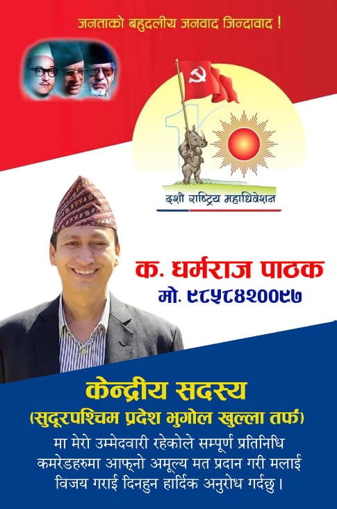 काठमाडौं, मंसिर ९ गते । नेकपा (एमाले) का युवा नेता कैलालीको धनगढी निवासी धर्मराज पाठकले एमालेको दशौं महाधिवेशनमा भूगोल (सुदूरपश्चिम) बाट खुला केन्द्रीय सदस्य पदमा उम्मेदवारी घोषणा गर्नुभएको छ ।