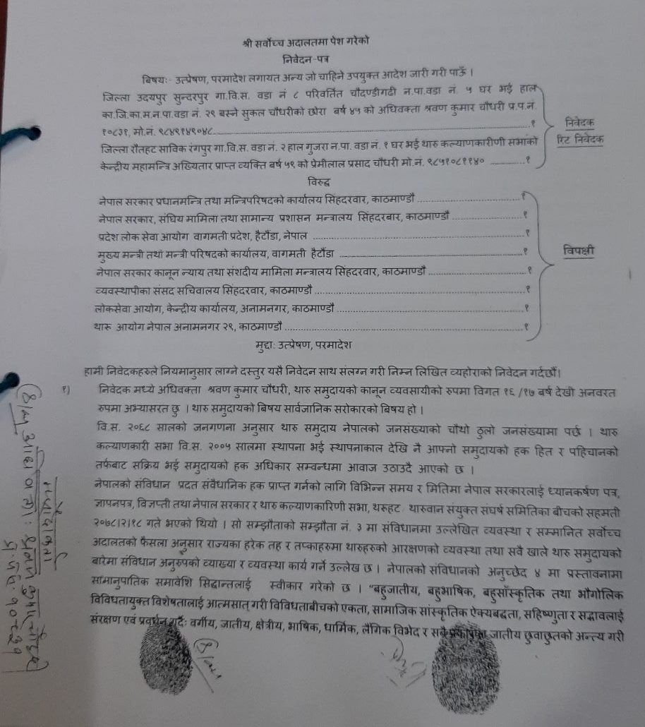 थाकसका महामन्त्री प्रेमीलालप्रसाद चौधरी र अधिवक्ता श्रवणकुमार चौधरीले थाकसको तर्फबाट संयुक्तरुपमा सो रिट दर्ता गराउनुभएको हो । रिट निवेदनमा नेपाल सरकार प्रधानमन्त्री तथा मन्त्रिपरिषदको कार्यालय, संघीय मामिला तथा सामान्य प्रशासन मन्त्रालय, प्रदेश लोकसेवा आयोग बागमति प्रदेश हेटौडा, मुख्यमन्त्री तथा मन्त्रिपरिषदको कार्यालय बागमति प्रदेश हेटौडा, नेपाल सरकार कानुन, न्याय तथा संसदीय मामिला मन्त्रालय सिंहदरवार, व्यवस्थापिका संसद सिंहदरवार, लोकसेवा आयोग केन्द्रीय कार्यालय, थारु आयोग नेपाल अनामनगरलाई विपक्षी बनाइएको छ ।