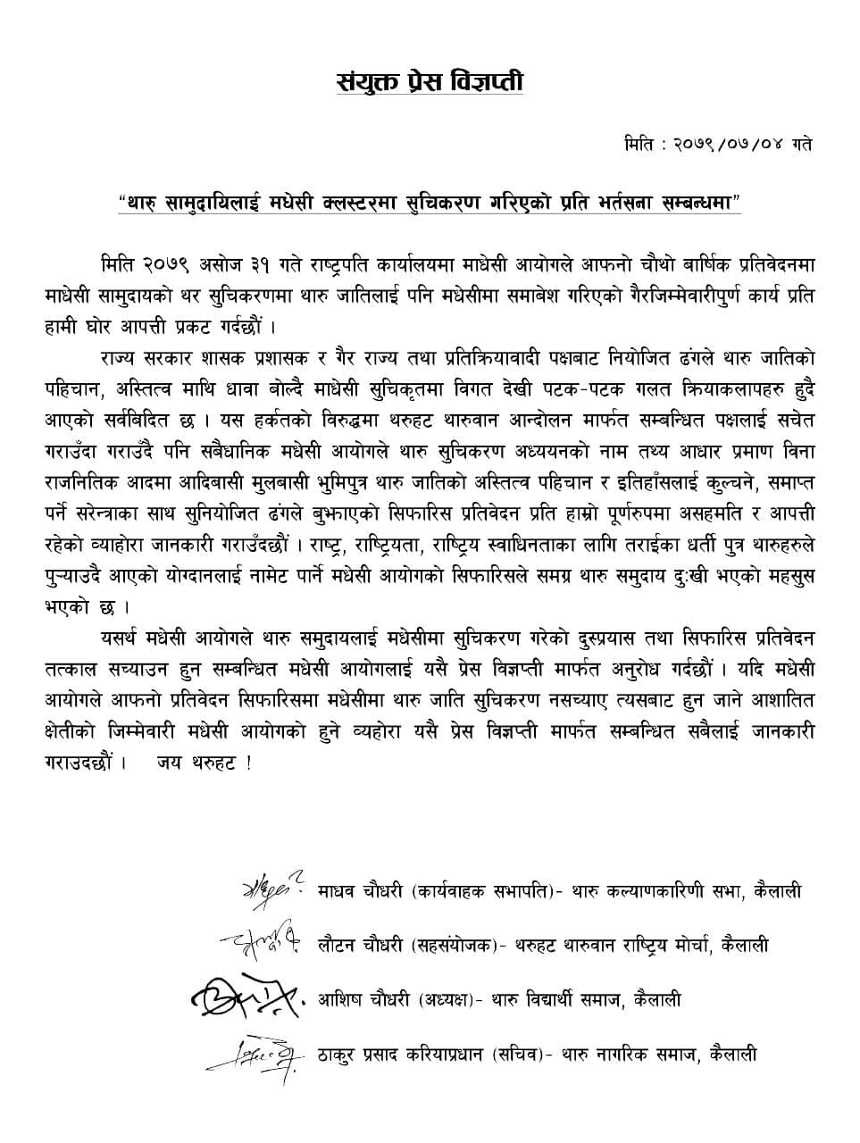 धनगढी, कात्तिक ४ गते । मधेसी आयोगले तराईको सबैभन्दा ठूलो समुदाय थारुलाई मधेसीमा सूचीकरण गरेकोप्रति कैलालीका थारु अगुवाले आपत्ति जनाएका छन् । थारु कल्याणकारिणी सभा (थाकस) कैलाली, थरुहट थारुवान राष्ट्रिय मोर्चा कैलाली, थारु विद्यार्थी समाज, कैलाली र थारु नागरिक समाज कैलालीले संयुक्तरुपमा विज्ञप्ति जारी गर्दै सो आपत्ति जनाएका हुन् ।