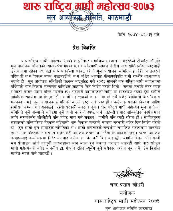 केही दिन अगाडी मात्रै मन्त्रिपरिषदको बैठकले थारु विद्यार्थी समाजले राजधानीको टुडिखेलमा आयोजना गरेको माघी महोत्सवलाई पहिलोचोटी चार लाख पचास हजार दिने निर्णय गर्यो र विगत १५ बर्षदेखि राजधानीमा माघी महोत्सवको आयोजना गर्दैआएको थारु कल्याणकारीणी सभा उपत्यका समितिलाई २ लाख ५० हजार रुपैया मात्रै दिने निर्णय गर्यो । यो निर्णयसंगै यतिबेला दुई समुहबीच विवाद उत्कर्षमा पुगेको छ ।