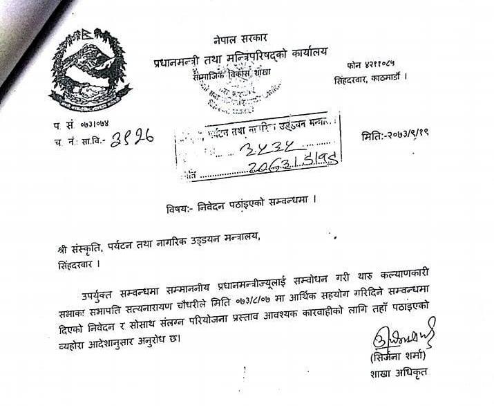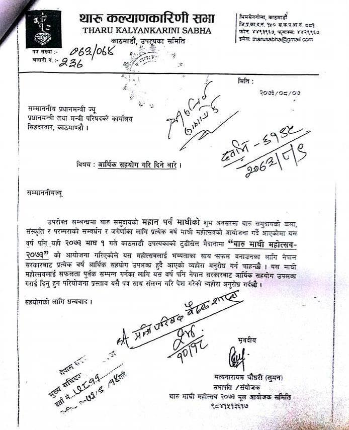 थारु कल्याणकारीणी सभाले संस्कृति पर्यटन तथा नागरिक उड्यान मन्त्रालय र अर्थ मन्त्रालयमा दर्ता गरेको फाईल फोटो सहित ।।
