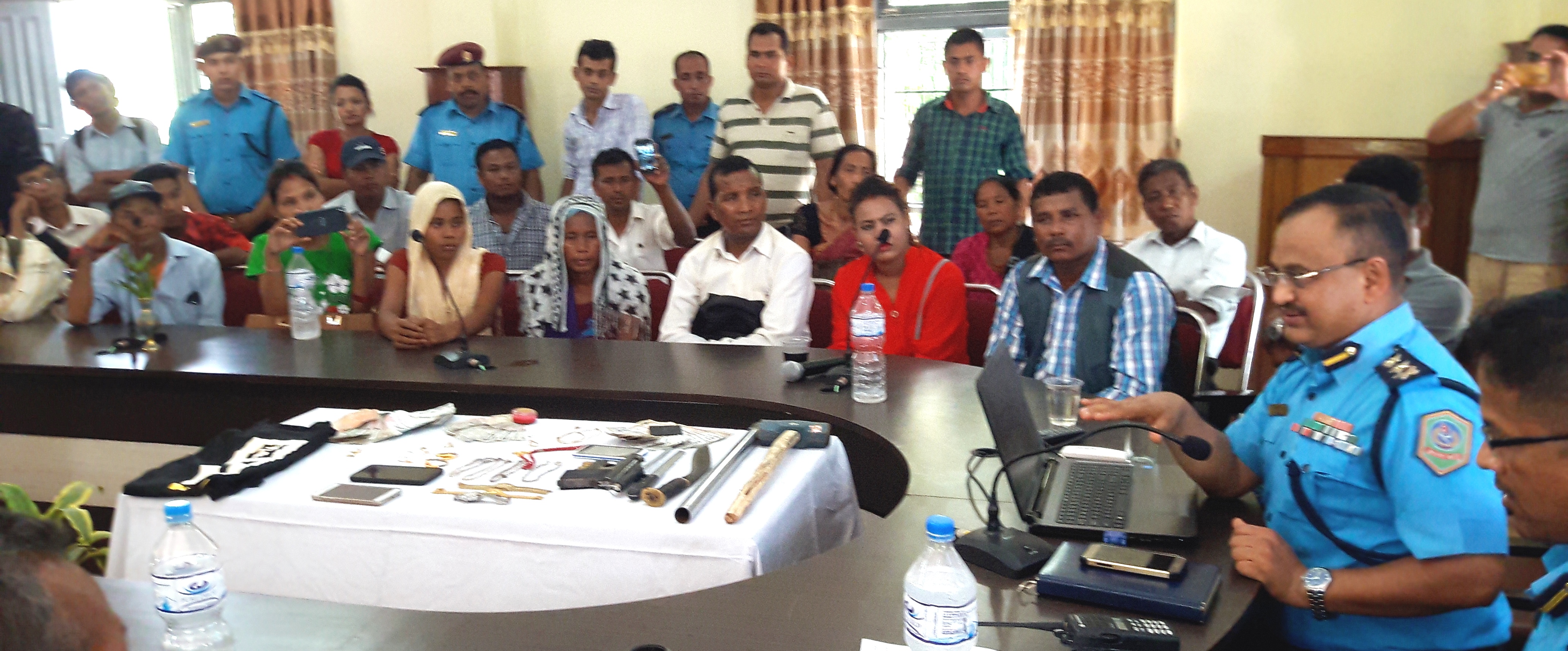 पक्राउ परेका दुई लुटेराहरु र लुटेर लगेका नगद, गरगहना र प्रयोग भएका हातहतियार बरामद गरी आज सार्वजनिक गरिएको छ । बरामद गरिएका नगद ८३,१४० रुपैयाँ, मोबाइल फोन ३ थान, हातहतियारहरुमा पेस्तोल १ थान, पेस्तोलको गोली ६ थान, घटनामा प्रयोग भएको ह्यामर, मोटरसाइकलको सकर रड, खुकुरी १ थान, चक्कु १ थान, पेचकस १ थान, सुनचाँदीका गरगहनाहरुमा सुनको सिक्री १ थान रहेका छन् ।
