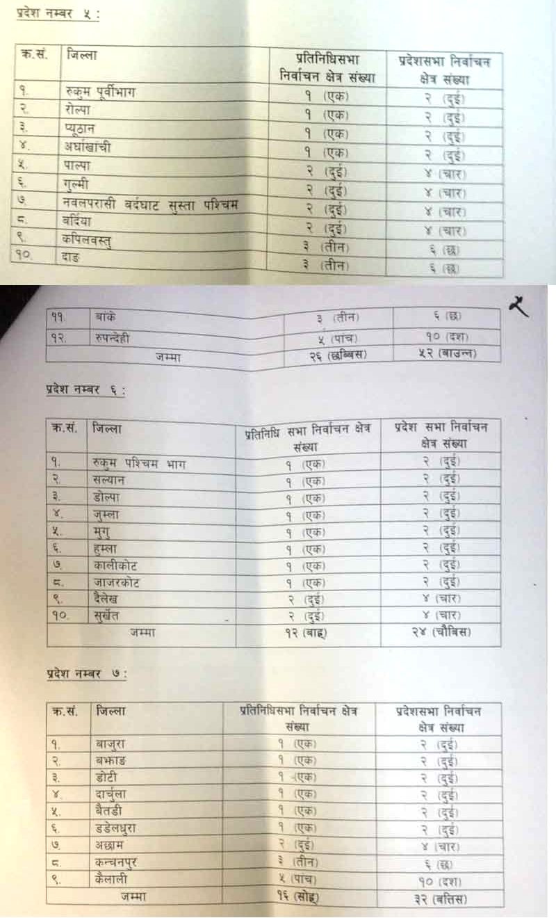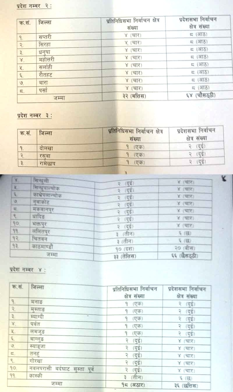 दुई नम्बर प्रदेशका हरेक जिल्लालाई चार क्षेत्र बनाइएको प्रतिवेदनमा सबैभन्दा धेरै तीन नम्बर प्रदेशमा ३३ क्षेत्र रहनेछन्। दुई नम्बरमा ३२, एक नम्बर प्रदेशमा २८, चार नम्बरमा १८, पाँच नम्बरमा २६, छ नम्बरमा १२ र सात नम्बरमा १६ प्रतिनिधि सभाका क्षेत्र रहने व्यवस्था गरिएको छ ।