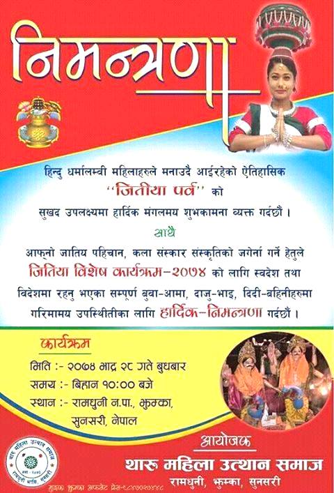 झुम्का, भाद्र २५ गते । हरेक वर्षझैं थारु समुदायले मनाउने जितिया पावनी पर्व यस वर्ष पनि सुनसरीको झुम्कामा भव्यरुपमा गर्ने तयारी थारु महिलाले गरेका छन् । सो पर्वमा थारु महिला निराहर व्रत बसी मनाउने गर्छन् ।